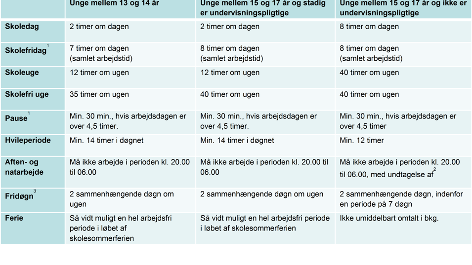 - [1] Bortset fra denne pause skal den daglige arbejdstid ligge samlet, hvis den er 7 timer (13-14 årige) og 8 timer (15 og opefter) eller derover.
