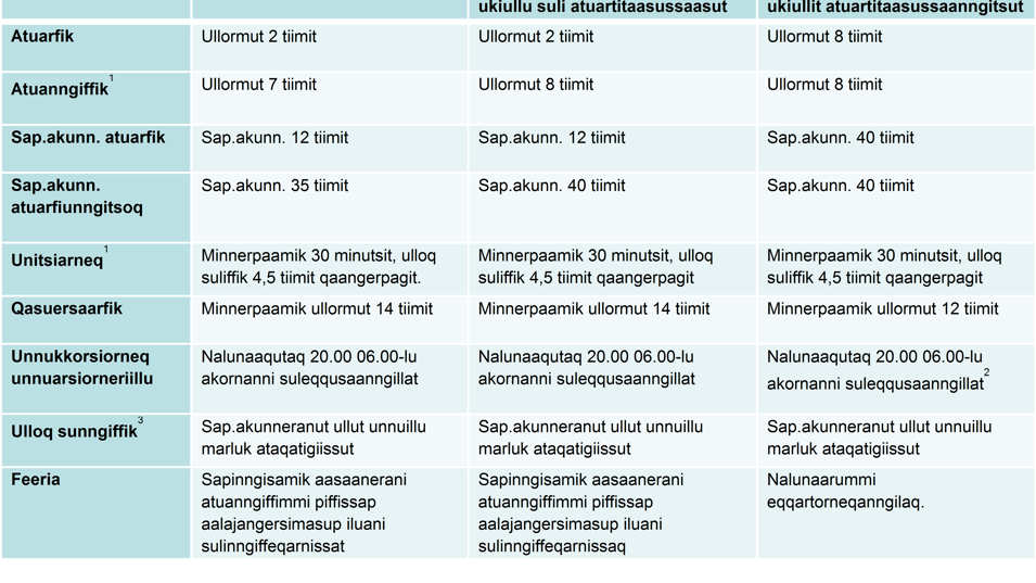 - Unnukkut qulit tungaanut: allaffeqarfiit / pisiniarfiit / kiffartuussisoqarfiit il.il.